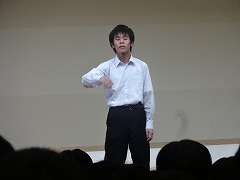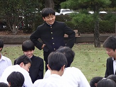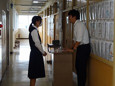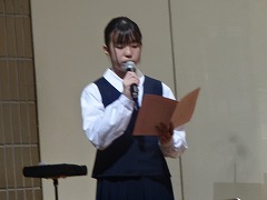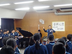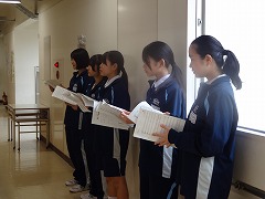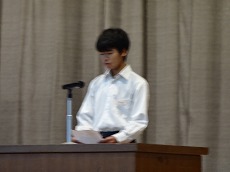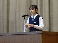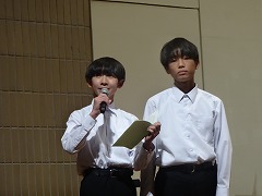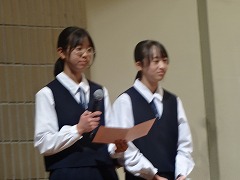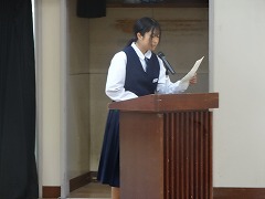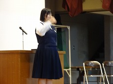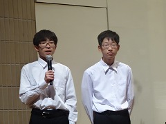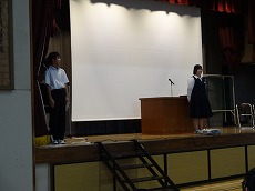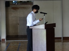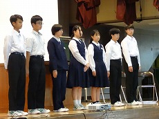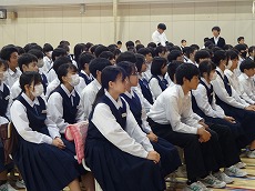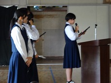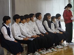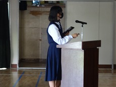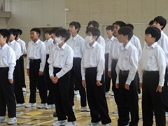 使節団の報告会の後、生徒会本部役員任命式が行われました。今までの本部役員からそれぞれ話をした後、新本部役員が任命されました。代表して新生徒会長から所信表明がありました。続いて行われた前後期交代式では、校歌斉唱の後に各学年の代表から、前期の反省と後期に向けての話がありました。代表にふさわしい立派な態度と内容でした。