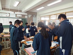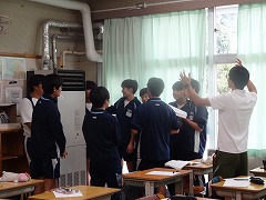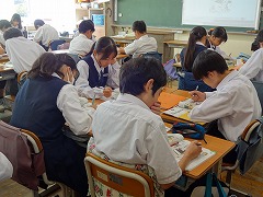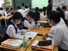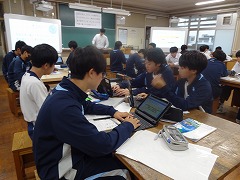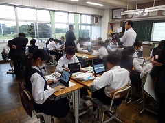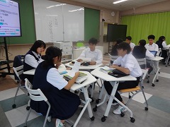 多くの教科でタブレットの活用が盛んです。3年生の社会科では「パレスチナ問題」について調べて、レポートを作っています。3年生の理科では発電に関して各自の考えをタブレットで共有しています。3年生の英語科では動画の英文での字幕作りを各自考えて、共有しています。さすが3年生、タブレットの扱いがスムーズです。