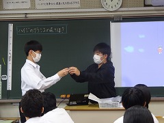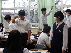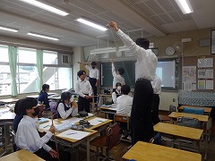 英語の文を伝言で伝えるゲームをしました。列ごとの対抗で、ALTの先生から一番後ろの席の生徒に英文が伝えられ、それを前の生徒に回していき、先頭の生徒がALTの先生に伝える伝言ゲームです。英文だとなかなかうまく伝わらないものですね。