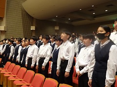今日は市の音楽ホールで合唱コンクールです。現地集合で、どのクラスも早めに集合して練習です。開会式では全校で校歌をうたいました。