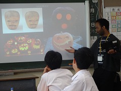 ALTの先生が、ハロウィンをはじめいろいろな国のお祭りについてのクイズをスライドで作りました。班対抗で考えて盛り上がりました。