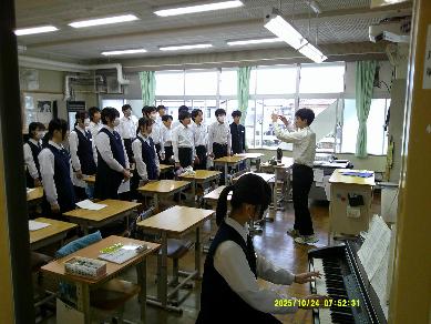 2年生は帰りの会をつかって合同合唱練習です。曲は「花は咲く」で、2年生も初めて合わせたので、まだまだですが、真摯な姿勢が伝わる合唱でした。今後の成長に期待です。
