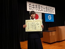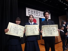 白井市民文化祭で、市長賞、議会議長賞、教育長賞に選ばれた児童生徒の表彰式が、市文化会館中ホールにて行われました。本校からは、市長賞書写の部、議会議長賞書写の部、議会議長賞家庭の部に選ばれた3人が出席して表彰されました。おめでとうございます。