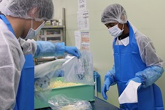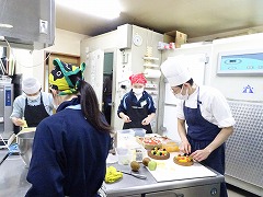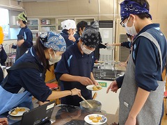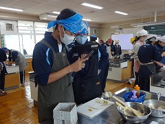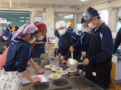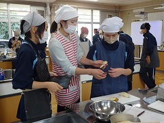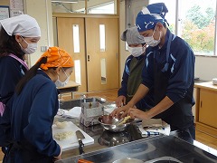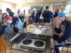 調理実習で梨ジャム作りをしています。煮込んでほんのりときつね色になったジャムから甘い香りが漂ってきます。ビスケットにつけて食べました。当然、とてもおいしいです。