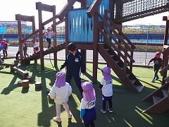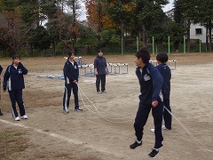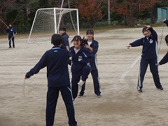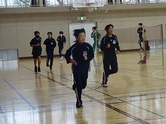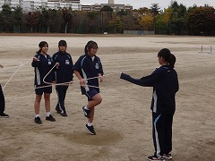 女子は陸上競技です。アップを兼ねて縄跳び2つを使ってダブルダッチをやっています。最近の子供達はリズム感が良く、とても軽快に跳んでいます。