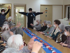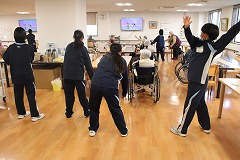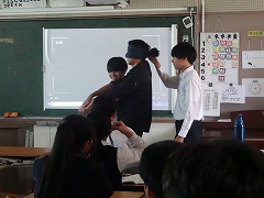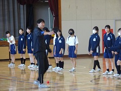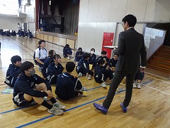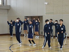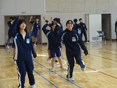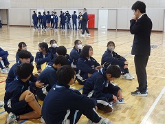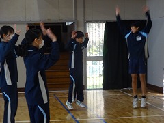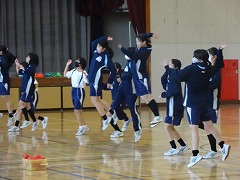 男女合同で体育館でダンスの授業をし、ジャンボリミッキーを踊りました。学年の先生も飛び入りで参加し、ノリノリに踊っています。