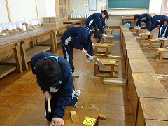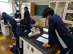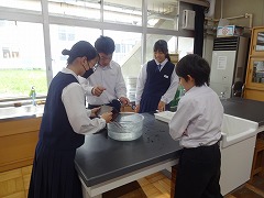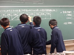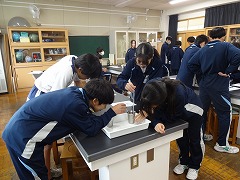 露点を調べて、理科室内の水蒸気量を調べる実験をしました。各班ごとにコップを冷やして、露がつく温度を調べます。班によって、けっこう結果がばらつきました。次の時間でまとめます。