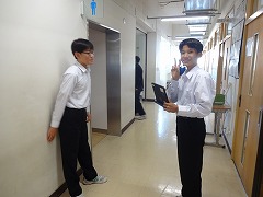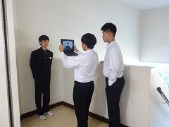 2年生は職場体験の時、職場に持って行く自己紹介カードをタブレットで作っています。そのための自分の写真を、廊下の壁を背景にして撮影しています。爽やかな笑顔で自己PRです。