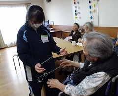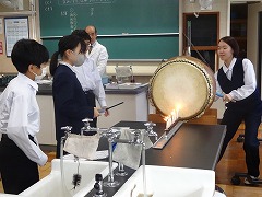理科室で音の伝わり方の実験を行っています。水面で音叉を鳴らしたり、糸電話を使ったり、大太鼓をたたいたりと身近ないろいろな物で音の伝わり方を感じています。