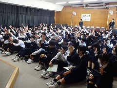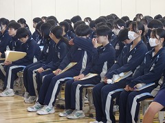2年生は1時間目に、職場体験を終えての集会を開きました。感想を挙手で聞いてみると、多くの生徒がこの2日間、楽しく、そして仕事について考える良い機会となったようです。みんな良い表情をしていました。