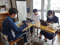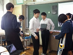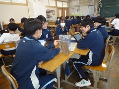 天体の勉強をしています。タブレットを使ってのプラネタリウムです。4人が四方の夜空を映し出し、1分ごとに星の動きを進めていき、中央の生徒が観察です。タブレットはいろいろな使い道がありますね。