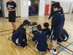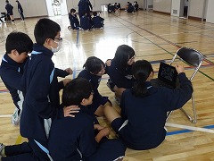 1年生もダンスの授業で「ジャンボリミッキー」を踊ります。まずはグループごとにタブレットで動画を見て、動きを確認します。そのあと全体で練習です。班ごとに創作部分もあり、和気藹々と練習しています。