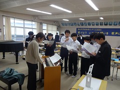 合唱曲「春に」のパート練習をしています。各パートごと、リーダーを中心に音取りを進めています。美しいハーモニーの完成が期待されます。