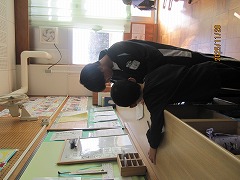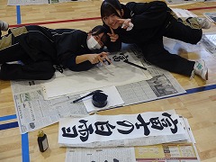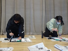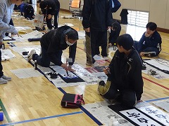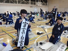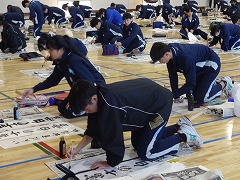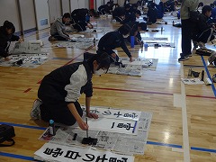 体育館に集まって、3年生全員で書き初め練習会を行いました。課題は「富士の白雪」です。最初に全体で注意する点を確認した後、各自それぞれ練習です。凜と張り詰めた雰囲気の中、集中して練習しました。先生方も一緒に頑張っています。