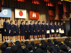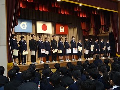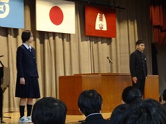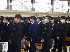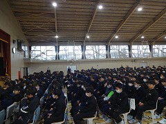 冬休み明けての最初の集会が体育館で行われました。集会前に秋からここまでの表彰が行われました。部活動の大会、コンクールや教科で表彰を受けた生徒がたくさん登壇しました。集会では久しぶりに校歌を歌い、さわやかな歌声が響き渡りました。
