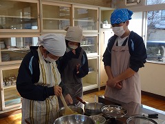 調理実習で、肉ジャガを作っています。具材はすでに刻み終わり、煮込んでいる班が多いです。調理室中にいい匂いが立ちこめています。