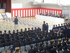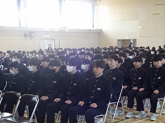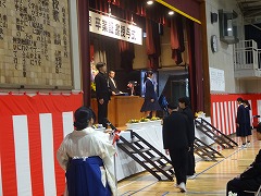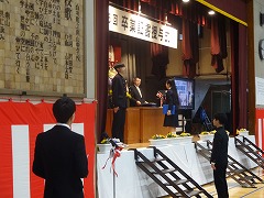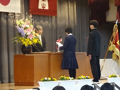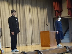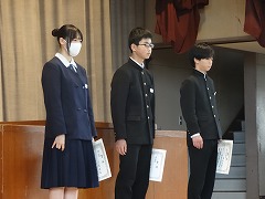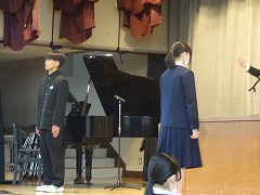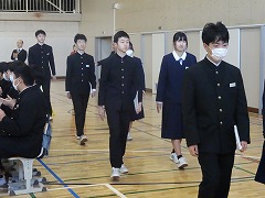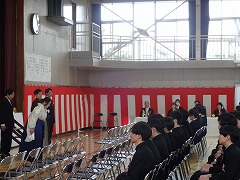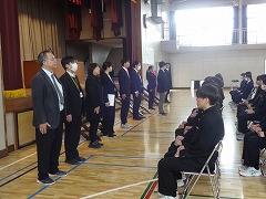 午前中を使って、卒業証書授与式の予行練習を行いました。祝辞等は動きだけで、あとは本番同様に行いました。3年生の式に臨む姿勢を見て、1,2年生達も身が引き締まります。本番はさらに立派な態度、感動の歌声が期待されます。練習終了後、3年生の書き初めの表彰と、皆勤賞の表彰がありました。皆勤賞は5名受賞です。3年間、遅刻、早退、欠席なしは本当にすごいことです。おめでとうございます。