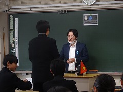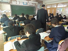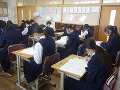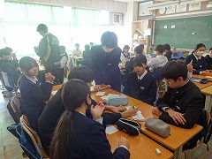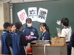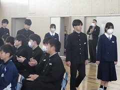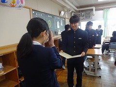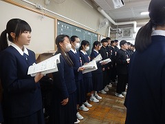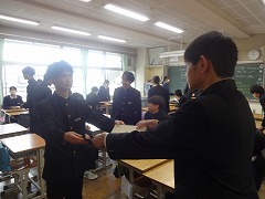 1時間目は各学級で卒業証書授与の練習をしました。クラスによって、グループで行ったり、全員が見守る中、担任の先生と行ったり、それぞれ工夫していました。いよいよ明後日は予行練習です。