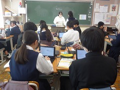 日本の歴史を勉強しています。元寇などが日本に及ぼした影響について調べています。先生が補佐しながら、教科書を読み込んだ入り、タブレットで調べたり、周りに聞いたりして学習を進めています。たまごプロジェクトの先生も来ています。