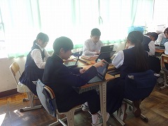 ALTの先生に1年間のお礼の手紙を英語で書いています。日本語を英語にするのにわからないところは、タブレットを活用しています。心のこもった英文の手紙になるよう頑張っています。
