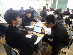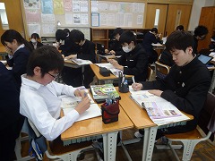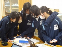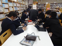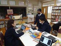 英語で日本国内の旅行計画を立てています。今日は図書室を使って、ガイドブックとタブレットによるインターネットの2通りで調べています。図書室は特に京都、奈良関係の本が充実しています。