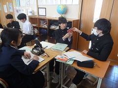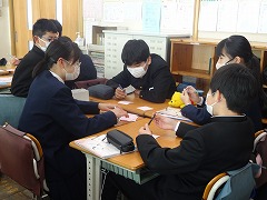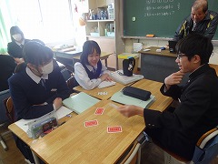 確率の授業で、「当たり2枚はずれ3枚の5枚のくじから2回引くとき、1回目に引くときと2回目に引くときのどちらが当たりやすいか」を調べました。各班でトランプを使って実験です。どの班も楽しそうに実験していました。