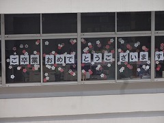 午後は1,2年生で会場等の準備をしました。2年生は主に体育館の中とその周り、1年生は校舎内の清掃と3年生の教室の飾り付けです。3年生のためにみんな真剣に丁寧に頑張りました。図書室や給食の配膳室も担当の方々からのお祝いメッセージが飾られました。本番に向けて準備万端です。