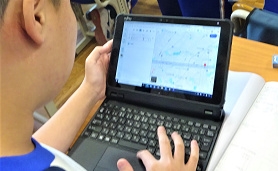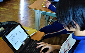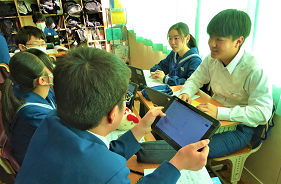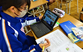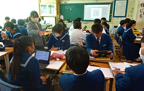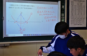 1/14の授業風景は、英語では「英語で1分間話し合うにはどのような工夫が必要だろう?」に取組み、数学では「基本の作図を使って問題を解くときにポイントとなることは何だろう?」に取組み、技術や社会ではタブレットを活用した内容の理解や整理に取組んでいました。それぞれにICTを活用したり、友達との対話を通して学んだりと「脳に汗かく授業」をめざして展開していました。
