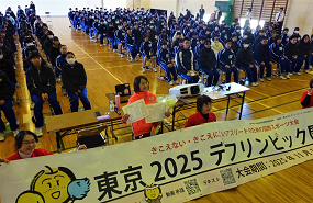 田井さんは、32年前に七次台中の陸上競技部に所属し、白井市の中学生で初めて日本一となった選手です。卒業後は高校・大学と競技を続け、順風満帆の競技人生を送っていました。しかし、大人になってから耳の病気にかかり耳が聞こえなくなってしまいました。それでも田井さんは、障がいを持つことになってからデフリンピックと出会い競技を続けました。国内のみならず海外での世界選手権に臨み、素晴らしい結果を収めてきました。その後、結婚・子育てを経て「もう一度挑戦する」と心に決め、新たな種目に挑みました。昨年開かれた東京デフリンピックでは日本代表に選ばれていながら、種目開催が認められず出場を果たすことが出来ませんでした。