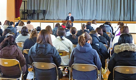 1/26の午後からこの4月に入学してくる新入生の保護者の方々にお集まりいただき、七中の説明をさせてもらいました。寒い中でもたくさんの方々にお越しいただけけました。ありがとうございます。学校全体像・学習面・生活面・集金・PTA・地域展開等の説明をしました。体育館後方には新しい制服が並び、興味深く見ている方もいらっしゃいました。校長から「お家に帰ったらお子さんに伝えてください。七中のすべての生徒や先生はみんなの入学を心待ちにしているよ。」との話がありました。