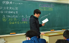 1/29の2年生の道徳の時間は授業者である担任を代えて実施しました。このパターンは2回目となります。生徒の様子は、隣のクラスの先生の授業は、意外と新鮮な気持ちになれて、新たな刺激を感じながら取り組めているようで、しっかり聞く姿勢や活発な発言などが見られます。