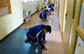 一方、3年生は公立高校受検2日目となり、私立等の受検が終わっている生徒は、頑張っているみんなのために、廊下磨きや校外のごみ拾いの奉仕活動に取り組んでいました。