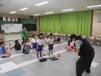 優しそうな人でも知らない人には「ついていかない」、道を聞かれても「車にはのらない」。危ないと感じたときには「おおごえでたすけて」と言う、そして「すぐににげる」、信用できる人に「しらせる」という「いかのおすし」について具体的に確認しました。実際に大人に捕まれない距離はどれくらいか、離れて確認したり、「たすけて」と大声を出す練習をしたりしました。どの子も真剣に取り組んでいました。これら場面が来ないことを願いながらも、いざというときに必要な練習だと感じました。