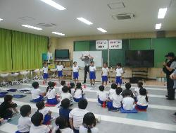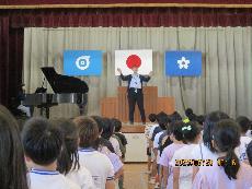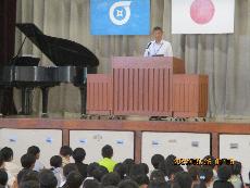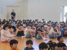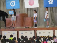 まずは、チアリーディングの全国大会で入賞した児童の表彰が行われました。その後、友達と仲良くなる秘訣について校長先生から話があり、新しいALTの先生の紹介がありました。最後に、生徒指導担当の先生から、放課後の校庭開放についてお話がありました。