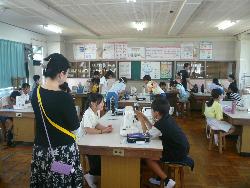 歯科衛生士さんを講師としてお迎えし、5年生、サポート学級、3年生を対象にした歯科保健指導が行われました。染め出し液で、歯の汚れぐらいを確認し、歯のブラッシング方法について学びました。