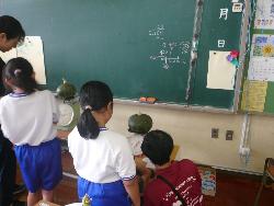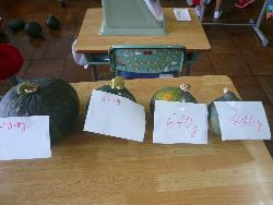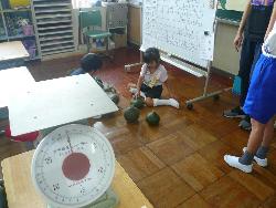 サポート学級では、カボチャを育ててきました。皆で大事に育ててきたので、大きなカボチャがたくさん獲れました。今日は、一つ一つのカボチャが○○kg○○gなのか重さを測る学習を行いました。