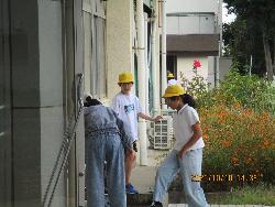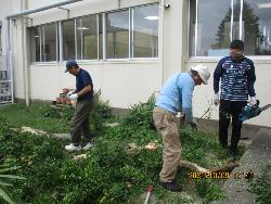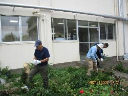 本校の敷地内には、カキの木が1本、ビワの木が1本、ザクロの木が2本あります。いずれもおいしそうな実がなるのですが、残念ながらカラスなどの鳥に食べられてしまいます。今の季節は、カキとザクロの実がなっています。ただ、1本のザクロの木は、どうも枯れ始めているようなので、今日は思い切って切ることにしました。この木の剪定には、まちづくり協議会の方にも御協力をいただきました。この木の最後の実も観賞用にとりました。