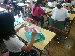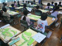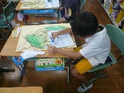 1年生が絵の具を使って、絵を描きました。1年生は水彩絵の具を使うことが初めてなので、筆を洗うバケツに入れる水の量、パレットの使い方、パレットへの絵の具の出す量など、細かい説明が必要です。先生3人体制で教えていました。