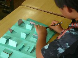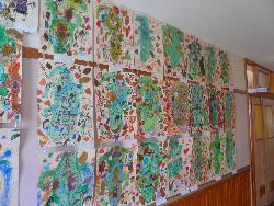 芸術の秋、運動会が終わると図工の作品展や音楽発表会が行われます。2年生の教室では図工が行われていました。「たてものまどをつくろう」というテーマで、カッターを使い窓をつくりました。廊下には、絵画の作品も展示されています。