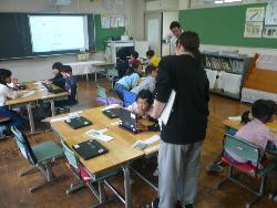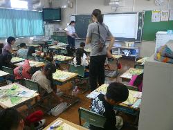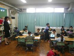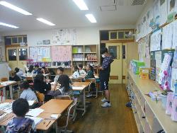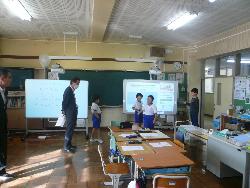 県教育委員会の事業として、市内の小学校の先生、3名が来校し、本校で研修を行いました。本校の職員の授業を参観し、授業の進め方や子どもへの接し方などを学んでいきました。職員室内では、良い授業についての討議が行われていました。