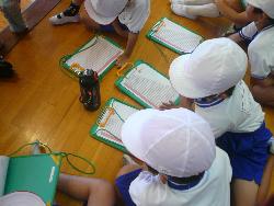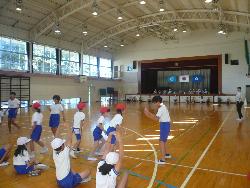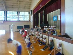 全国的な調査として行っているスポーツテストが本校でも行われています。今日は、2年生と5年生がペアになって、持久力を測る20mシャトルランを行っていました。2年生はどれくらいの速さで走ってよいのかわからないので、5年生が励ましながら併走していました。