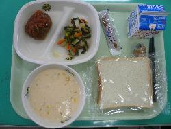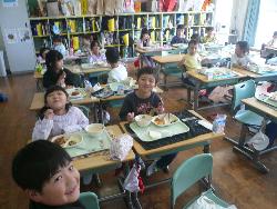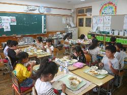 子どもたちが楽しみにしている給食ですが、今月は、新メニューが10品あります。今日はその一つ、「煮込み風ハンバーグ」でした。デミグラスソースがたっぷりかかった柔らかくおいしいハンバーグでした。1年生と2年生の教室をのぞいてみましたが、おいしそうに食べていました。