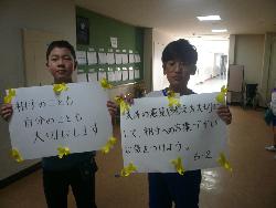 12月4日から10日までの人権週間にあわせ、イエローリボン人権集会が行われました。各学級で話し合いを行い、決定したスローガンを放送で発表しました。「けんかのないクラスにしよう」「1日5回ふわふわ言葉を使おう」「相手の意見を認められる学級にしよう」などの発表がありました。このみんなで決めたスローガンですが、絵に描いた餅にならないよう実践していくことが何より大切です。更に、大山口小学校を思いやりのある仲のよい学校にしていきたいと思います。