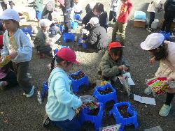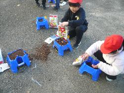 来年の春になると新入生が入学してきます。1年生は、生活科の学習で、チューリップの球根を植えました。春になり新入生の入学式の頃、このチューリップが花を咲かせ、入学式の会場を彩ります。1年生の子どもたちは、このチューリップを大切に育てていきます。
