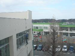 本校の校舎北側はベランダがなく、窓掃除をすることができません。そのため、今日は業者さんによる窓掃除が行われました。屋上からロープをつたって降り、窓掃除をしてくれました。寒い中での危険な作業です。おかげさまで、北側の窓がきれいになりました。ありがとうございました。
