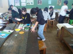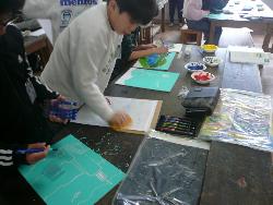 今年度も残り少なくなってきました。学習も大詰めです。5年生は、図工科で、多色彫り版画を行っていました。彫刻刀を使って作成した版を使い、数回にわたり色インクで重ね彫りしていました。きれいな作品ができました。
