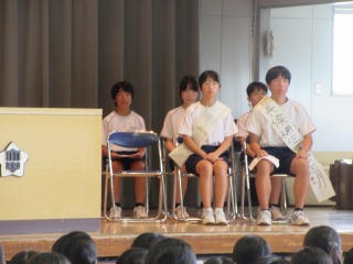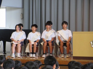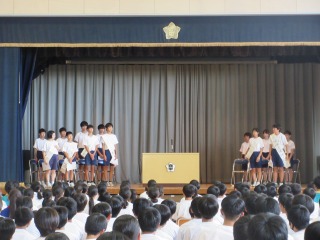 全校集会の前に表彰を行いました。今回は、ボランティア部・美術部・水泳大会・陸上部・ソフトボール部・吹奏楽部・硬式テニス部の皆さんが表彰されました。