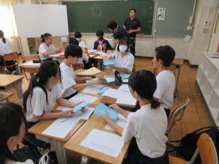 1年生の理科の授業では、物質の溶け方について学習しています。今日は、角砂糖を水に溶かすと、水の中でどのような状態になっているかを考えました。