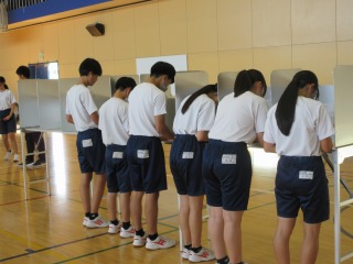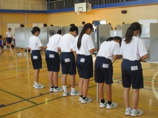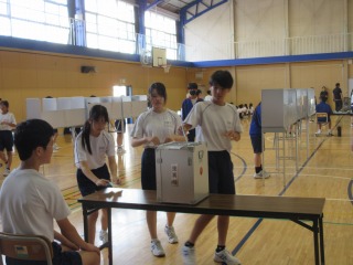 午後の時間を使って、生徒会役員に立候補した生徒の立ち会い演説会を行いました。その後、投票に移りました。記載台と投票箱は、市の選挙管理委員会より実際の選挙で使っているものをお借りして行いました。
