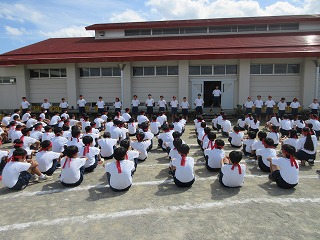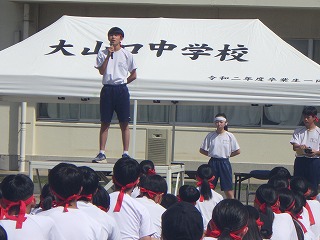 体育館からリモートで全校集会を行いました。校長先生からは、「体育祭や合唱コンクールと大きな行事があるので、皆でいいものを作っていこう、皆で良さを伸ばしていこう。」と話がありました。その後、生徒指導担当の先生と防災の日のため安全担当の先生の話がありました。
